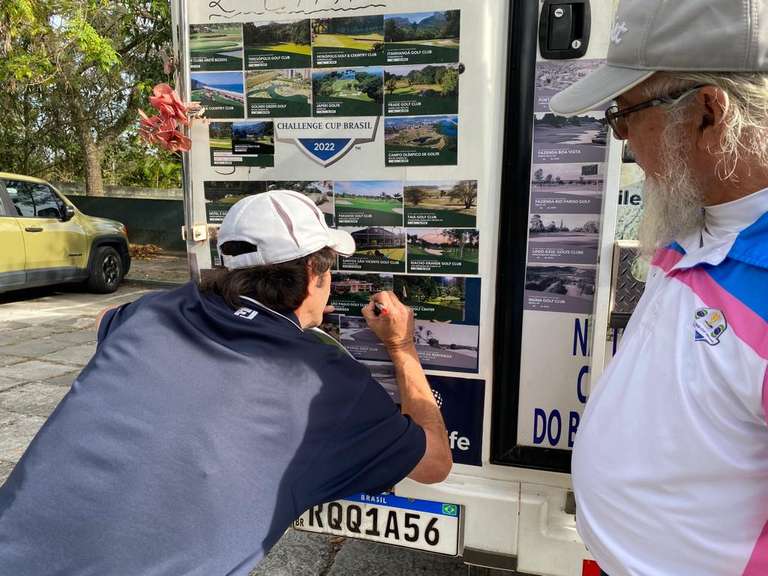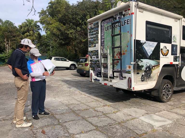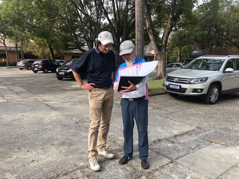 O São Paulo Golf Club é um dos mais prestigiados clubes de golfe do Brasil. O acesso a ele, portanto, não é nada fácil. O protocolo é ter convite de um sócio, de terças às sextas-feiras. Mas, felizmente, Eduardo é associado da Associação Brasileira de Golfe Sênior – ABGS, e coincidiu de acontecer o 12º Torneio ABGS Golfe Sênior durante a Etapa São Paulo do projeto Na Toca pelos 117 Campos de Golfe do Brasil e, assim, fizemos sua inscrição para o torneio e pronto. Nem foi muito difícil chegar lá, já que estávamos acampados na capital, no Honda Golf Center.